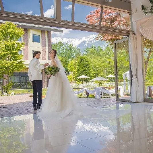 光と緑に包まれた開放感あるガラス張りのチャペルで、先輩花嫁も納得の感動体験。二人の誓いとゲストの大切な日を見守るのは雄大な中央アルプスの山々と爽やかな風。絶景と自然美が彩る記憶に残るウェディングを。
